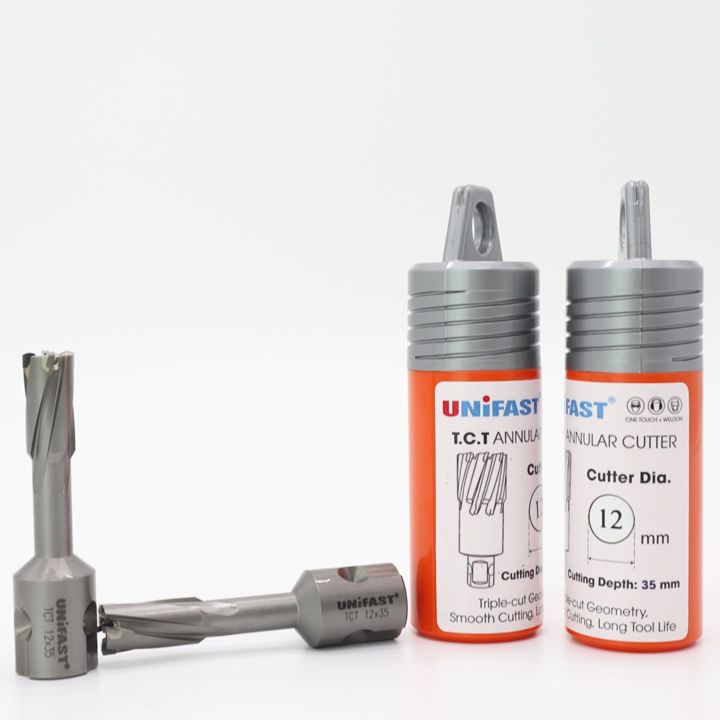 Mũi khoan từ hợp kim TCT hiệu UNIFAST phi 12 model TCT 12x35 trang bị cho mình lưỡi cắt gắn hợp kim đường kính 12mm. Khoan kiểu rút lõi tốc độ nhanh chóng và nhẹ nhàng.